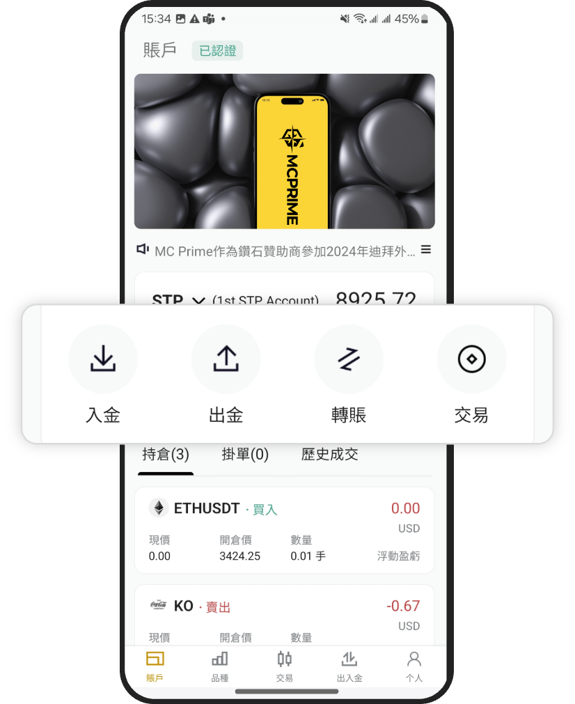 您可轻松管理交易,自定义观察列表,并掌握实时行情。MC Prime 提供丰富的差价合约品种,包括热门外汇、黄金等大宗商品、股票、指数及加密数字货币,让您高效布局多元市场。此外,MC Prime 提供负数清零功能,账户若出现负余额,系统将自动归零,确保您无需承担额外亏损,有效管控交易风险。