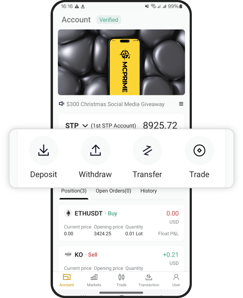 Ứng dụng MC Prime, có sẵn cho iOS và Android, cung cấp công nghệ giao dịch nâng cao và rút tiền, gửi tiền nhanh. Giao diện trực quan, đảm bảo trải nghiệm giao dịch suôn sẻ và hiệu quả.